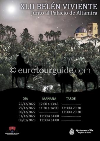 The 42nd Living Nativity Scene will take place in Elche City this Christmas. On the 25th, 29th, 30th and 31st December 2022 and on the 6th January 2023 you will be able to visit the Nativity scene in the Parque Deportivo along the Passeig de l’Estació, i front of the Parque Municipal.