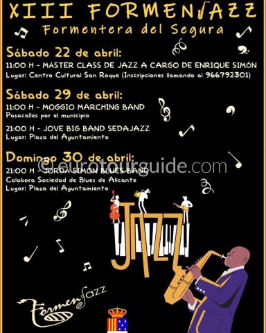 The 13th Jazz Festival will take place in Formentera del Segura on the 29th and 30th April 2023. There will be a three free Concerts to enjoy in the Plaza Ayuntamiento; on Saturday 29th April at 11:00 the Moggio Marching Band will parading and the Jove Big Band SedaJazz will be preforming in the evening at 21:00. On the Sunday 30th April JOrda Simon Blues Band will entertain you from 21:00.