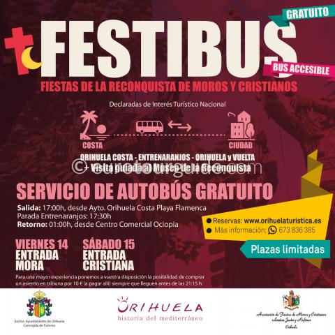 There will be several buses provided by the Town Hall from Playa Flamenca in the Orihuela Costa and Entre Naranjos to the Centro Comercial Ociopia in Orihuela for the Moors and Christians Fiesta on the 14th and 15th July 2023. The return journey from Playa Flamenca costs is free, but must be reserved in advance on the Tourist Office Website (Clicking Here) or via WhatsApp on 0034 673 836 385. The timetable is: