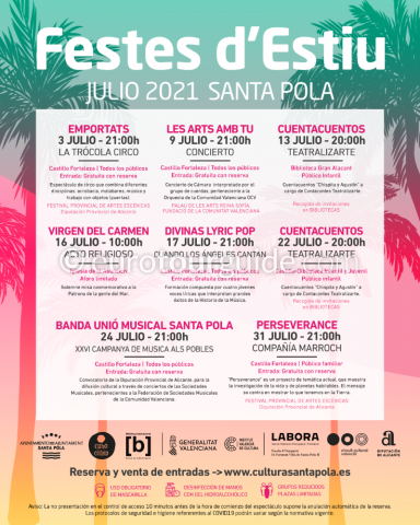 Santa Pola have put together a programme of concerts for July and August 2021. All of the preformances will take place in the Castle patio, unless otherwise stated. Tickets are required, they are released on the Monday preceeding the concert and can only be reserved online www.culturasantapola.es