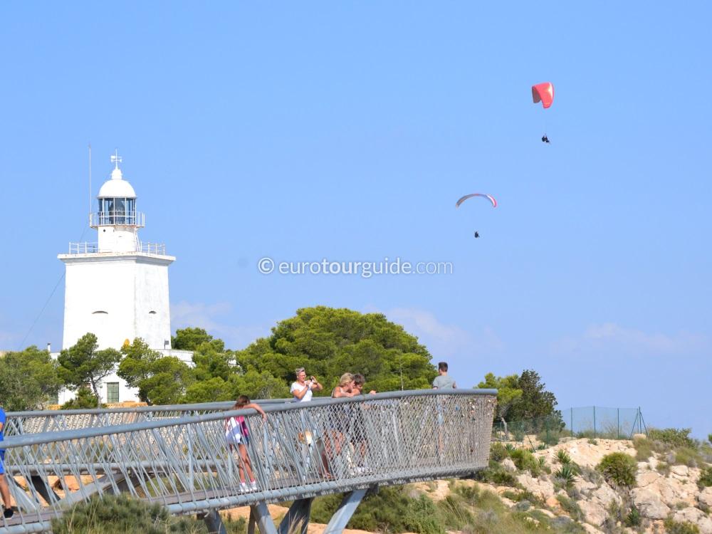 At the top of the cliffs is the lighthouse, known as the Faro de Cabo de Santa Pola. An excellent view point it offers stunning vistas and is surrounded by untamed countryside with two signposted, but many unmarked but well worn walking and cycling trails. In 2015 a metal platform called the Sky Walk was constructed, it protrudes slightly over the cliffs and gives the feel of walking in the air. There are two entrance and parking points, one at the top of the Gran Alacant urban area and the other just off the N332. Click to view the EuroTourGuide Positive Place that was filmed at the Sky Walk during Covid.